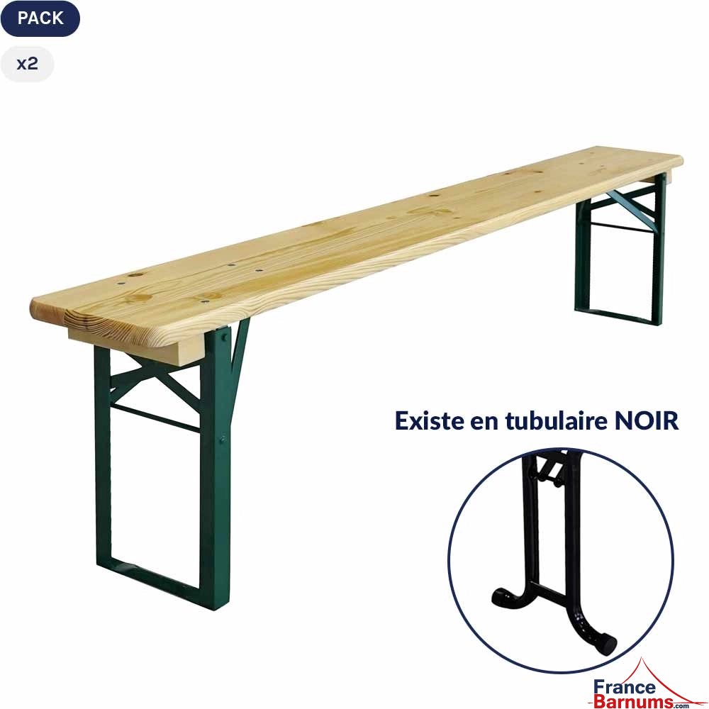 Notre banc brasserie bois pliant de 180x25cm, ici en lot de deux, est disponible en deux modèles, piétement en cornière vert ou tubulaire noir.