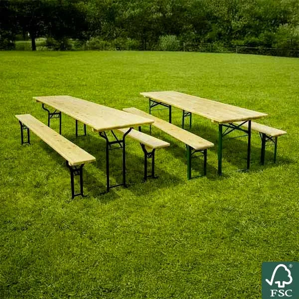 Donnez du caractère à votre terrasse, salle des fêtes ou établissement avec cet ensemble de brasserie bois. Il est composé d'une table pliante rectangulaire de 180x70cm et de 2 bancs pliants de 180x25cm assortis. Ils sont en pin européen, certifié FSC®*. Le bois est protégé par deux couches de vernis.