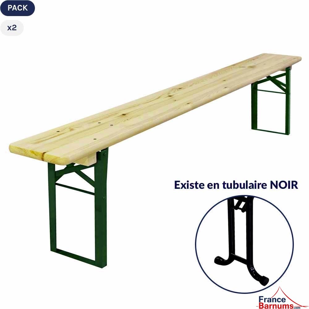 Notre banc brasserie bois pliant de 220x25cm, ici en lot de deux, est disponible en deux modèles : piétement en cornière vert ou tubulaire noir.