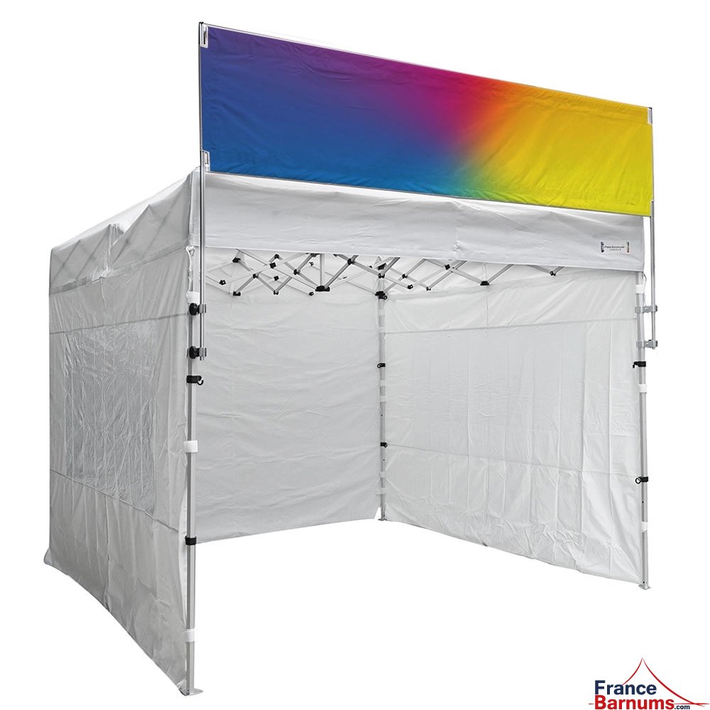 Démultipliez votre visibilité avec notre Sky Banner pour barnum pliant 3x3m et démarquez-vous instantanément lors de vos événements ! Cette bannière positionnée en hauteur transforme votre stand 3x3m en véritable panneau publicitaire visible de loin, que vous soyez sur un marché, une foire, un événement sportif ou une exposition.