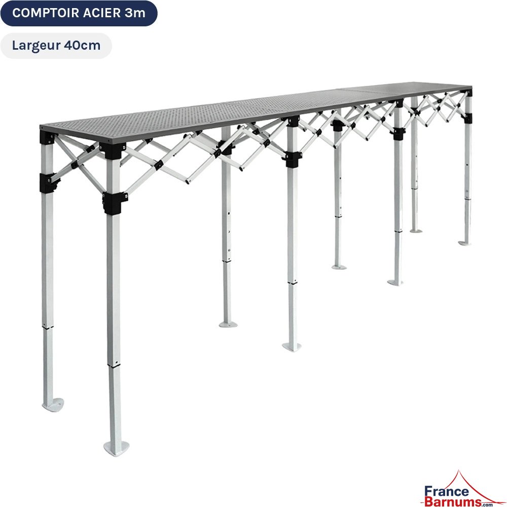 Polyvalente et robuste, notre table comptoir de 3m en acier s'adapte à tous vos besoins professionnels : borne d'accueil, bureau d'inscription, présentoir produits, stand de vente sur salons, expositions ou marchés, comptoir buvette pour vos événements... Disponible en deux largeurs (40 cm et 70 cm) pour s'ajuster parfaitement à votre espace et à vos contraintes, elle conserve la même longueur quelle que soit la version choisie.